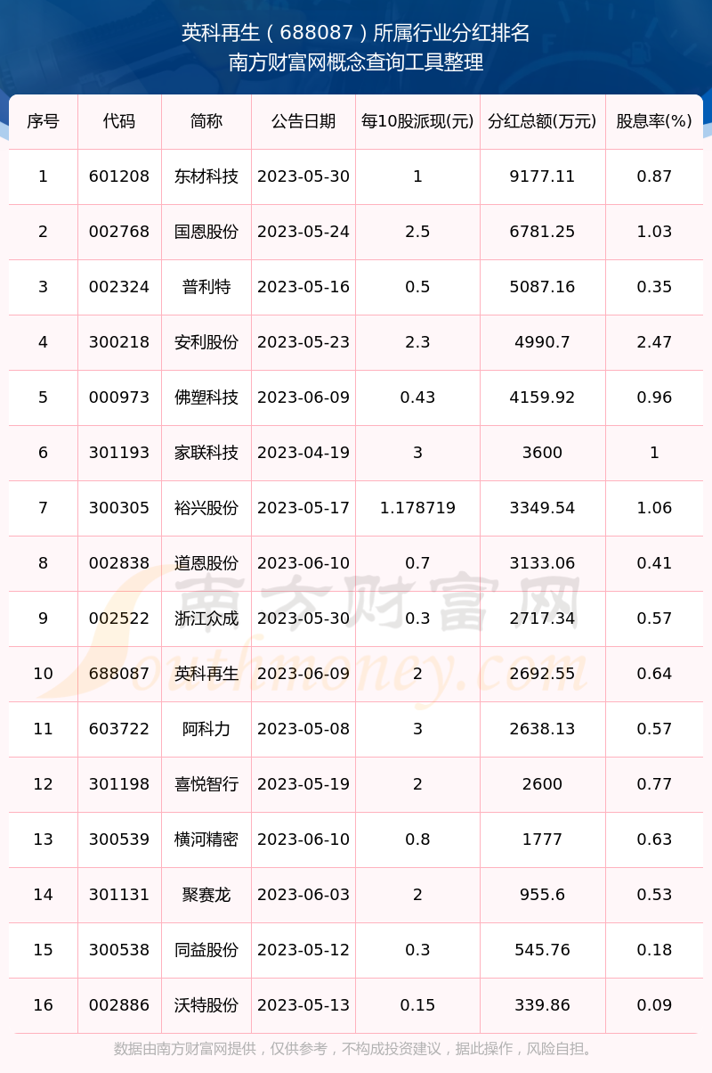 按照南方財富網(wǎng)趨勢選股系統(tǒng)統(tǒng)計,英科再生所屬行業(yè)為塑料制品行業(yè),塑料制品行業(yè)分紅排名情況如下表:
