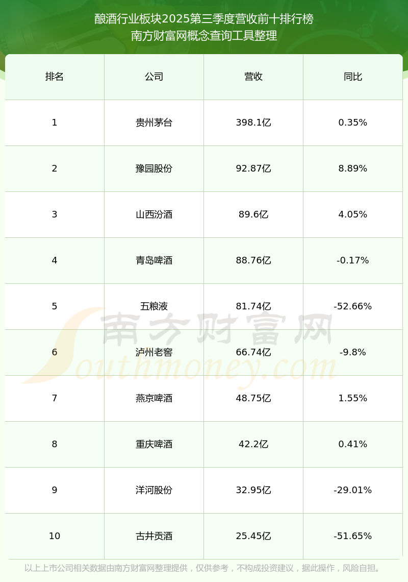 按照南方財(cái)富網(wǎng)概念查詢工具統(tǒng)計(jì),該股所屬板塊為釀酒行業(yè)板塊,該板塊共有42只股票,今世緣2025第三季度營收在該板塊中排名為第11名,該板塊2025第三季度營收排名前十的股票如下表: