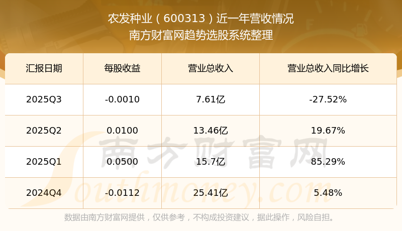 農(nóng)發(fā)種業(yè)(600313)披露2025年第三季度報告,報告期實現(xiàn)營收7.61億元,同比-27.52%;歸母凈利潤-105.57萬元,同比-873.54%;扣非凈利潤-532.84萬元,同比40.4%。