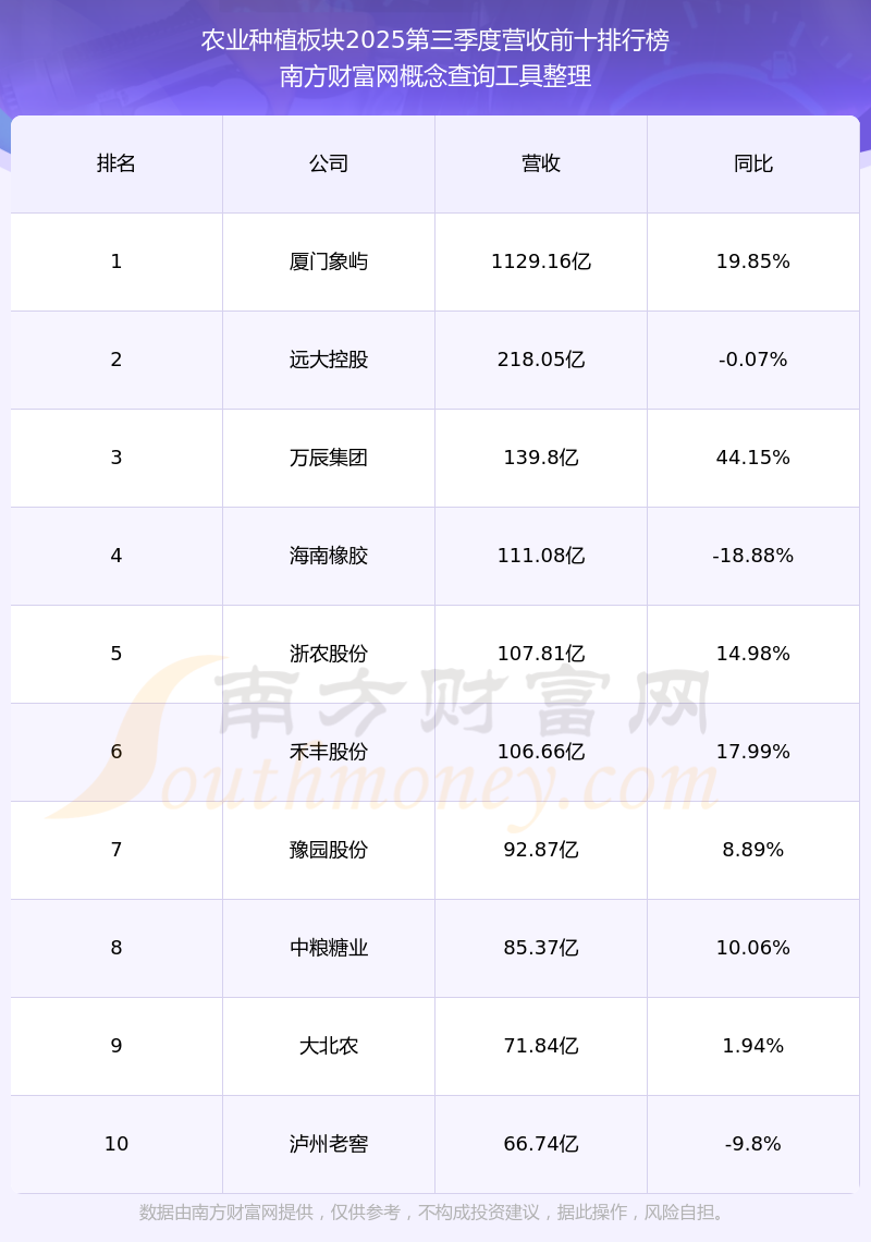 按照南方財富網(wǎng)概念查詢工具統(tǒng)計,該股所屬板塊為農(nóng)業(yè)種植板塊,該板塊共有94只股票,農(nóng)發(fā)種業(yè)2025第三季度營收在該板塊中排名為第41名,該板塊2025第三季度營收排名前十的股票如下表: