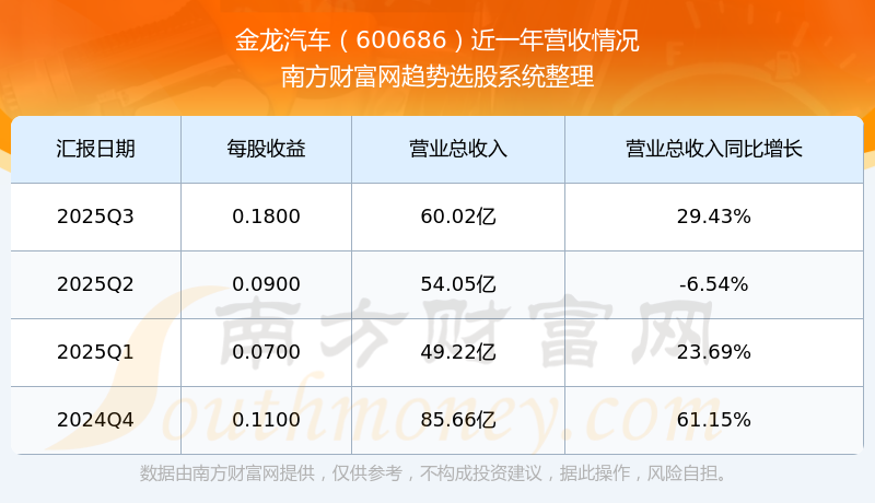 金龍汽車2025年第三季度財(cái)報(bào)顯示,公司主營(yíng)收入60.02億元,同比29.43%;歸母凈利潤(rùn)1.31億元,同比1211.04%;扣非凈利潤(rùn)7144.84萬(wàn)元,同比260.19%。