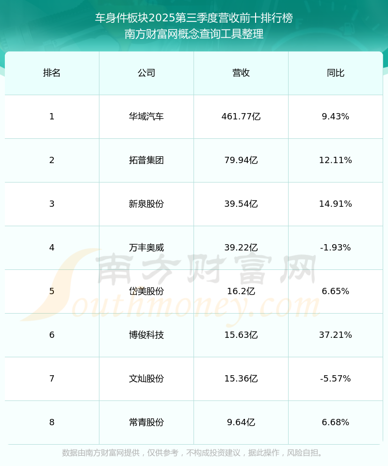 按照南方財(cái)富網(wǎng)概念查詢工具統(tǒng)計(jì),該股所屬板塊為車身件板塊,該板塊共有8只股票,金龍汽車2025第三季度營(yíng)收在該板塊中排名為第8名,該板塊2025第三季度營(yíng)收排名前十的股票如下表: