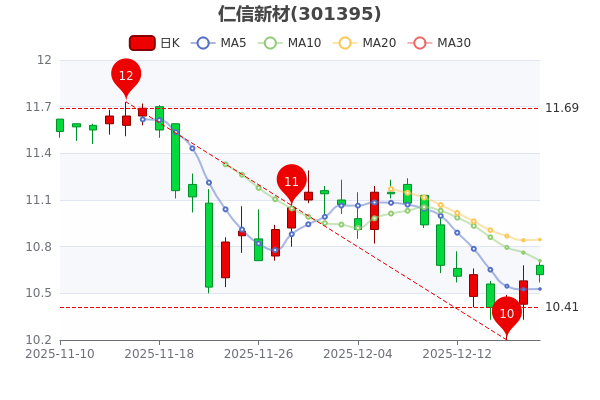 12月19日,仁信新材(301395)09時(shí)56分股價(jià)報(bào)10.590元,漲0.38%,市值為25.72億元,換手率0.26%,當(dāng)日成交額346.35萬元。