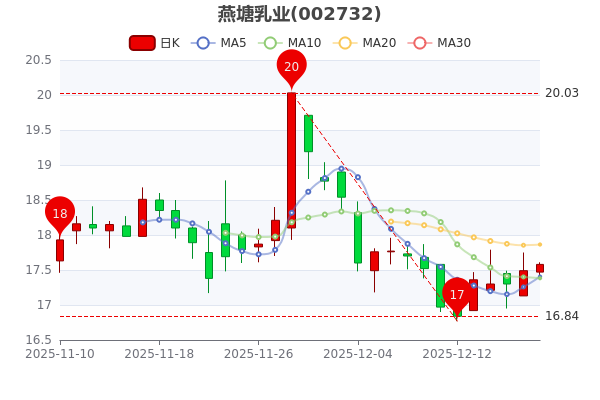 12月19日消息,燕塘乳業(yè)(002732)早盤漲0.46%,報(bào)17.430元/股,成交量58.8萬(wàn)手,換手率0.38%,振幅跌0.34%。