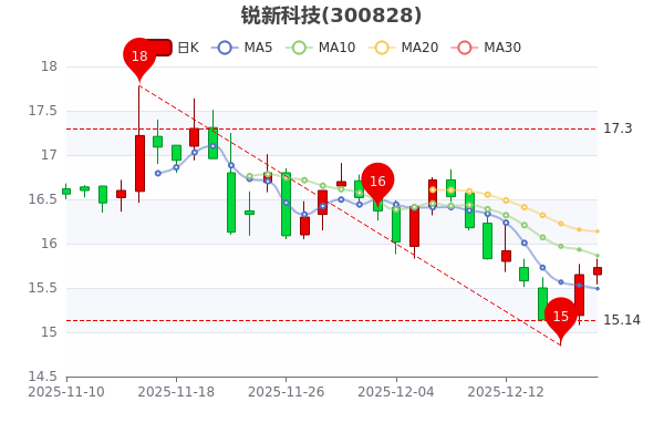 12月19日盤(pán)中消息,銳新科技7日內(nèi)股價(jià)下跌5.62%,最新漲0.51%,報(bào)15.730元,換手率0.82%。