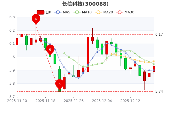 12月19日消息,長(zhǎng)信科技5日內(nèi)股價(jià)下跌0.34%,最新報(bào)5.930元,成交量2744.71萬(wàn)手,總市值為148.12億元。