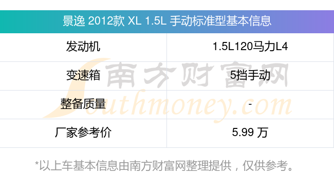 景逸 2012款 XL 1.5L 手動(dòng)標(biāo)準(zhǔn)型動(dòng)力上配備的是一臺(tái)1.5L120馬力L4自然吸氣發(fā)動(dòng)機(jī),匹配的是5擋手動(dòng)擋變速箱,燃料形式為汽油,廠家參考價(jià)5.99萬(wàn)元。