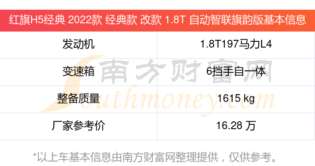 在動(dòng)力上,紅旗H5經(jīng)典 2022款 經(jīng)典款 改款 1.8T 自動(dòng)智聯(lián)旗韻版配備的是一臺(tái)1.8T197馬力L4渦輪增壓發(fā)動(dòng)機(jī),匹配的是6擋手自一體自動(dòng)檔變速箱,燃料形式為汽油+48V輕混系統(tǒng),常規(guī)整備質(zhì)量1615kg,廠家參考價(jià)16.28萬(wàn)元。