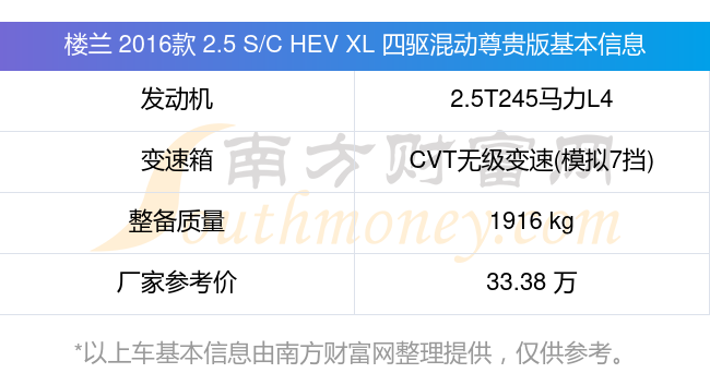在動力上,樓蘭 2016款 2.5 S/C HEV XL 四驅混動尊貴版配備的是一臺2.5T245馬力L4機械增壓發(fā)動機,匹配的是CVT無級變速(模擬7擋)自動檔變速箱,燃料形式為油電混合,常規(guī)整備質量1916kg,廠家參考價33.38萬元。