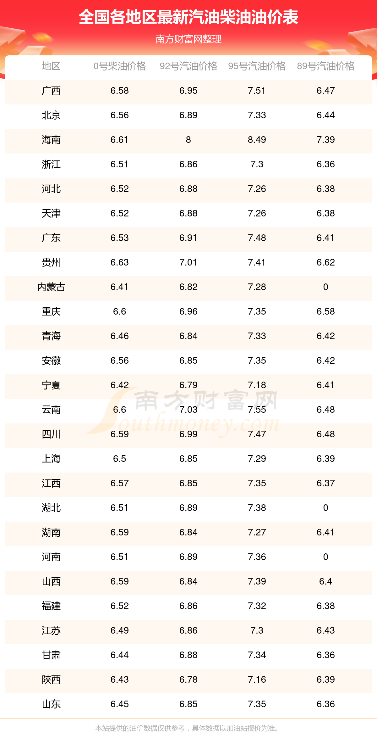 全國(guó)各地區(qū)2025年最新汽油價(jià)格表