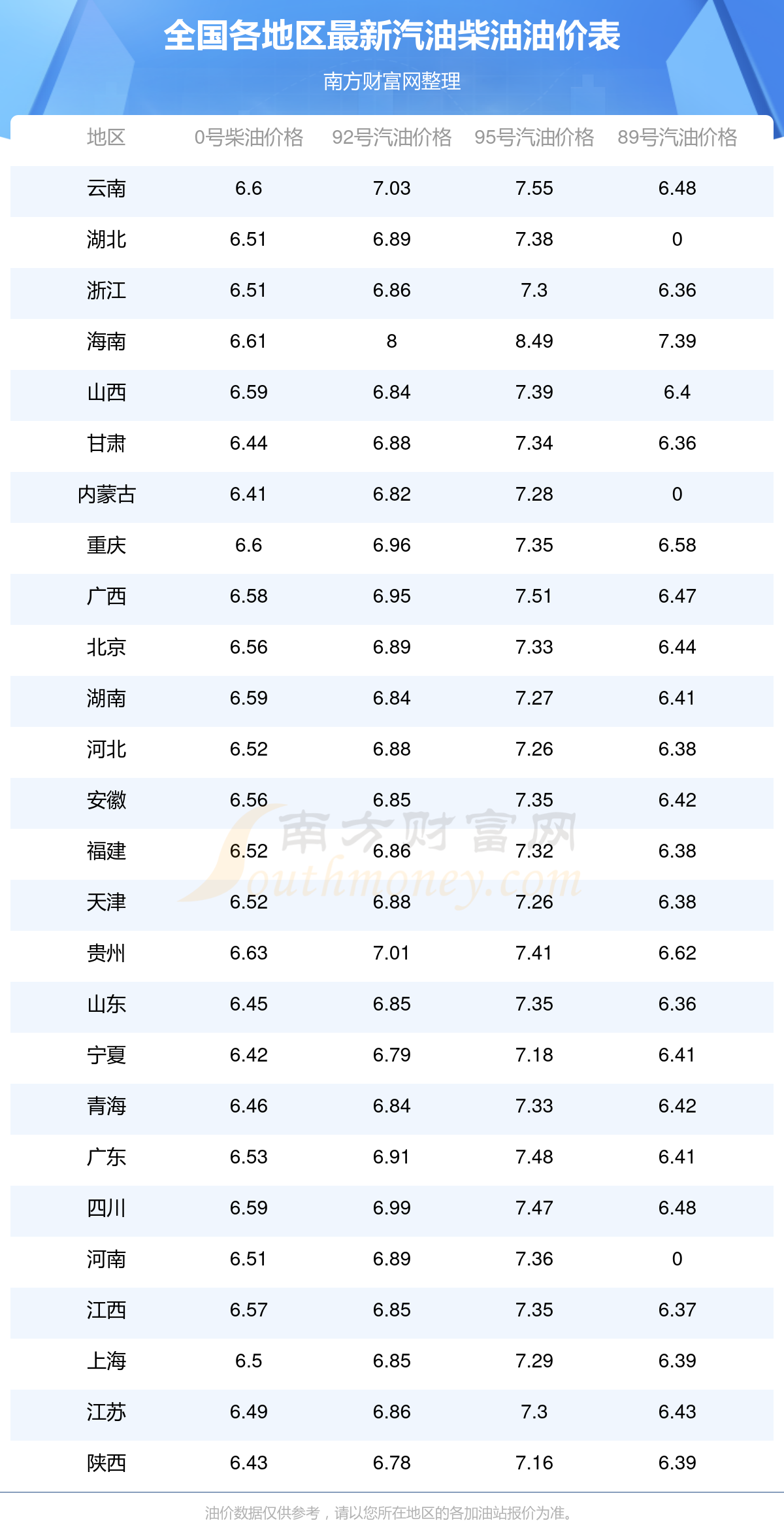這一輪油價調(diào)整的時間是11月25日,調(diào)整后全國油價的具體價格為:92號汽油平均價格為7元每升,其中,最低的是陜西,6.78元每升,最高的是海南,8.00元每升。95號汽油平均價格為7元每升,其中,最低的是陜西,7.16元每升,最高的是海南,8.49元每升。0號柴油平