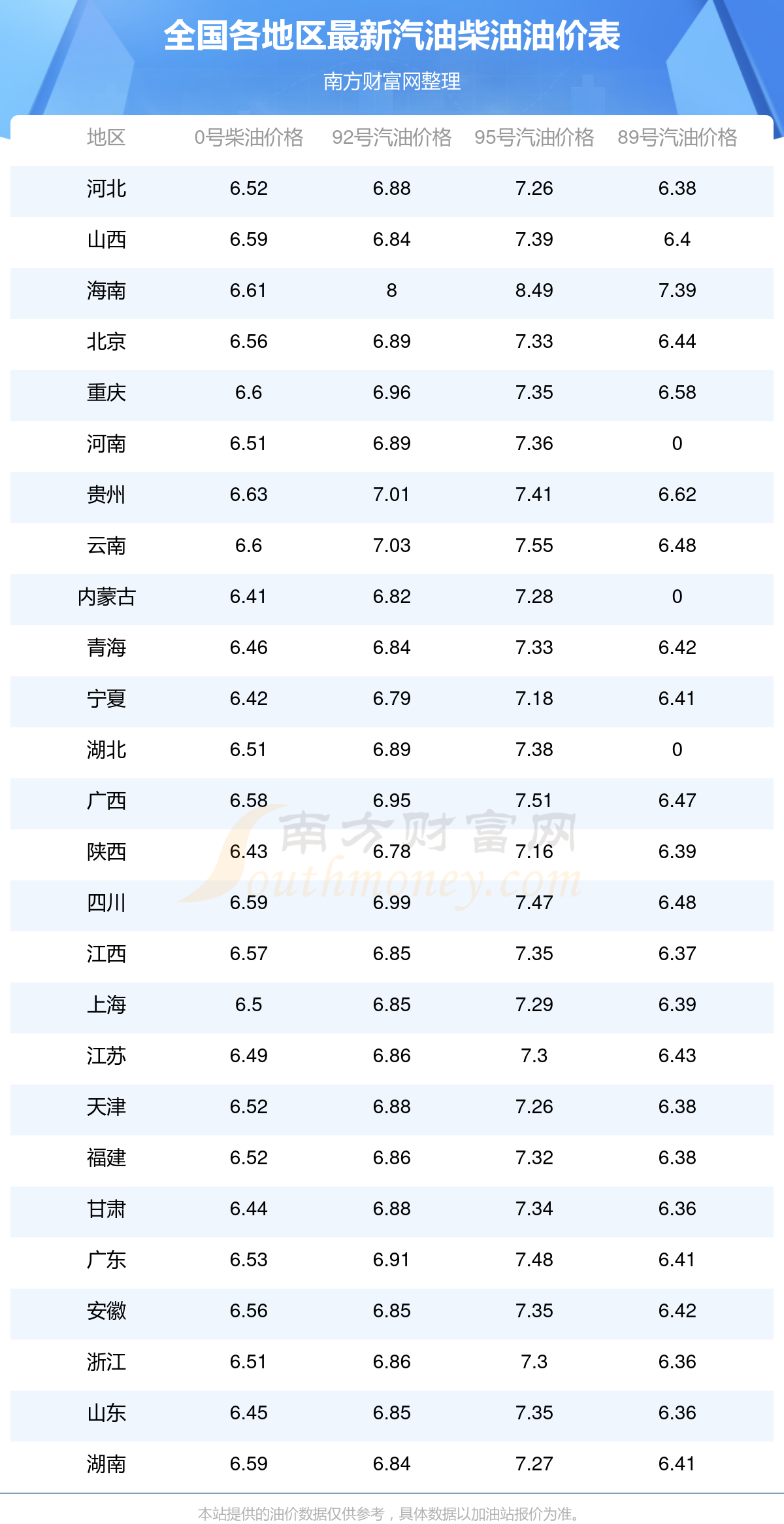 油價數(shù)據(jù)僅供參考,請以您所在地區(qū)的各加油站報價為準(zhǔn)。