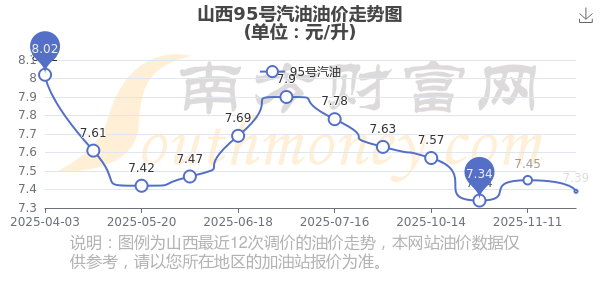 11月29日,山西95號汽油的價格是7.39元每升,本次的調(diào)整時間為11月25日,對比上次的調(diào)整下跌了0.06元,下跌0.805%,下次調(diào)整時間為12月8日24時,還有9.37天。