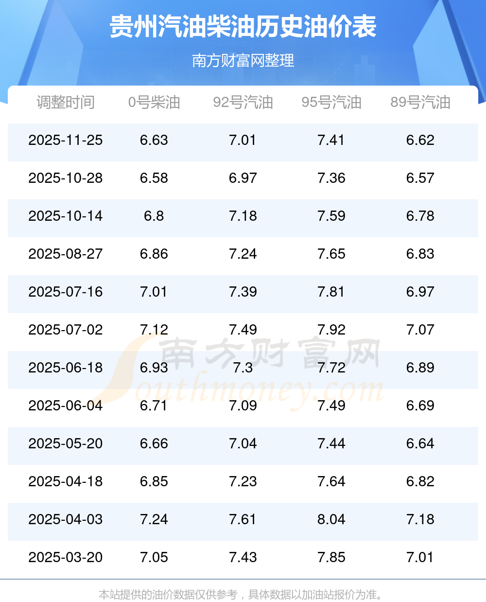 11月29日,貴州95號汽油的價格是7.41元每升,本次的調(diào)整時間為11月25日,對比上次的調(diào)整跌了0.06元,跌0.803%,12月8日24時為下一輪油價調(diào)整時間,還有9.37天。