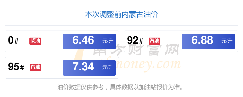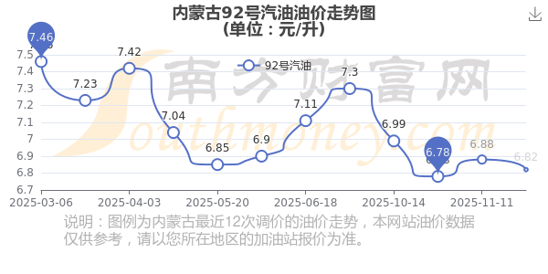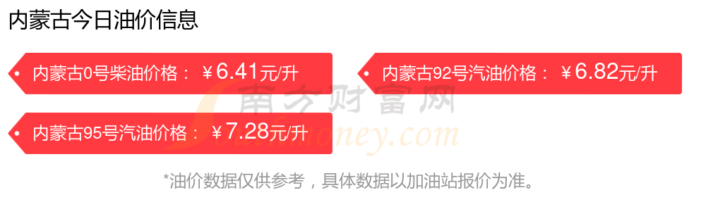 11月29日,內(nèi)蒙古汽油、柴油的價(jià)格為11月25日調(diào)整后的價(jià)格。具體為:92號(hào)汽油6.82元,下調(diào)了0.06元;95號(hào)汽油7.28元,下調(diào)了0.06元;0號(hào)柴油6.41元,下調(diào)了0.05元。