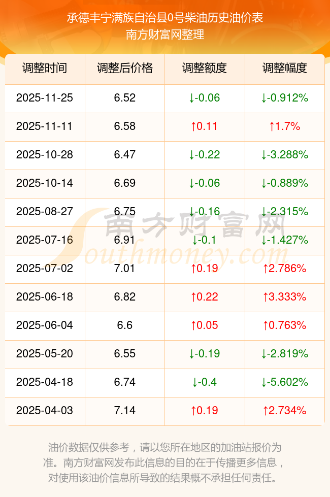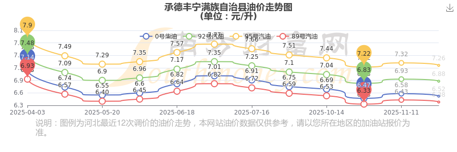 11月29日承德豐寧滿族自治縣0號柴油歷史油價一覽表