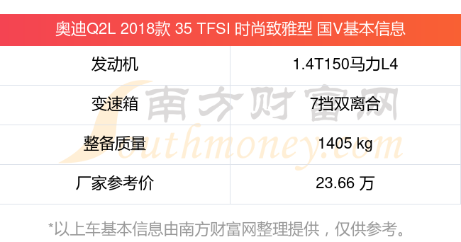 奧迪Q2L 2018款 35 TFSI 時(shí)尚致雅型 國V動(dòng)力方面,搭載的是一臺(tái)1.4T150馬力L4渦輪增壓發(fā)動(dòng)機(jī),匹配7擋雙離合自動(dòng)檔變速箱,燃料形式為汽油,常規(guī)整備質(zhì)量1405kg,廠家參考價(jià)23.66萬元。