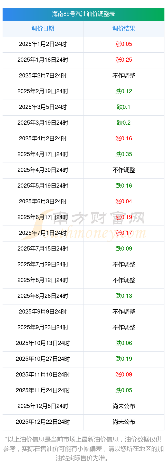 11月29日,海南89號汽油的價格是7.39元每升,本次的調(diào)整時間為11月25日,對比上次的調(diào)整下調(diào)了0.05元,下調(diào)0.672%,下次調(diào)整時間為12月8日24時,還有9.34天。