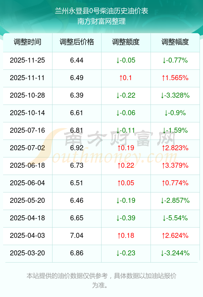 11月29日今日蘭州永登縣0號柴油價(jià)格一覽表