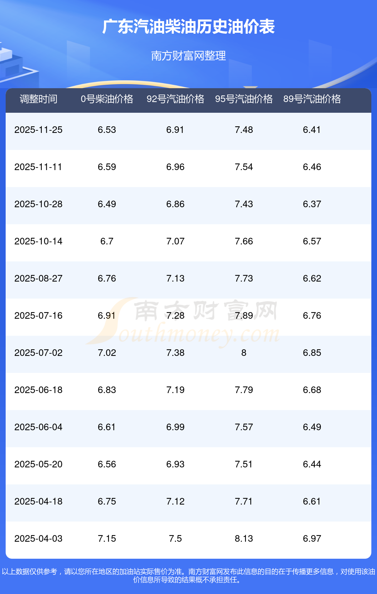 2025年廣東汽油價格一覽表