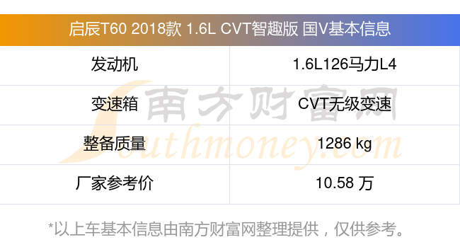 啟辰T60 2018款 1.6L CVT智趣版 國V動力上搭載的是一臺1.6L126馬力L4自然吸氣發(fā)動機,匹配CVT無級變速自動檔變速箱,燃料形式為汽油,常規(guī)整備質(zhì)量1286kg,廠家參考價10.58萬元。