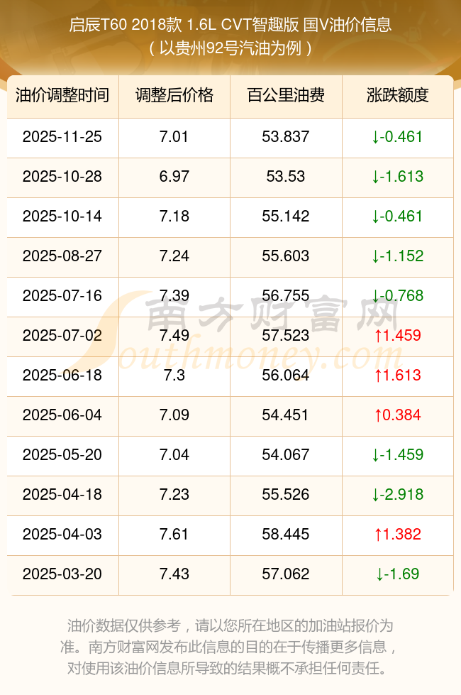 依照11月25日92號汽油最新調(diào)整價格7.01元/升來計算(以貴州為例),該車型百公里的平均油費是53.837元,依照上一輪10月28日調(diào)整價格7.07元/升來計算,百公里的平均油費是54.298元,對比上一輪少花0.461元,下一輪的油價調(diào)整時間12月8日24時。