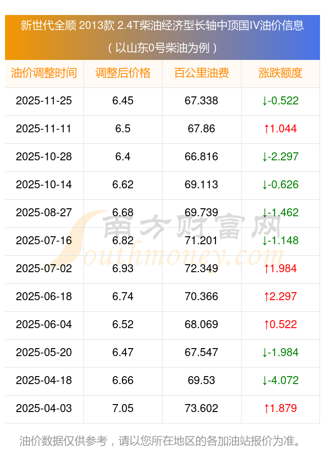 依照11月25日0號(hào)柴油最新調(diào)整價(jià)格6.45元/升來(lái)計(jì)算(以山東為例),該車型百公里的平均油費(fèi)是67.338元,依照上一輪11月11日調(diào)整價(jià)格6.5元/升來(lái)計(jì)算,百公里的平均油費(fèi)是67.86元,對(duì)比上一輪少花0.522元,下一輪的油價(jià)調(diào)整時(shí)間12月8日24時(shí)。