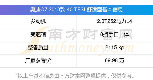 奧迪Q7 2018款 40 TFSI 舒適型動力上配備的是一臺2.0T252馬力L4渦輪增壓發(fā)動機,匹配的是8擋手自一體自動檔變速箱,燃料形式為汽油,常規(guī)整備質(zhì)量2115kg,廠家參考價69.98萬元。