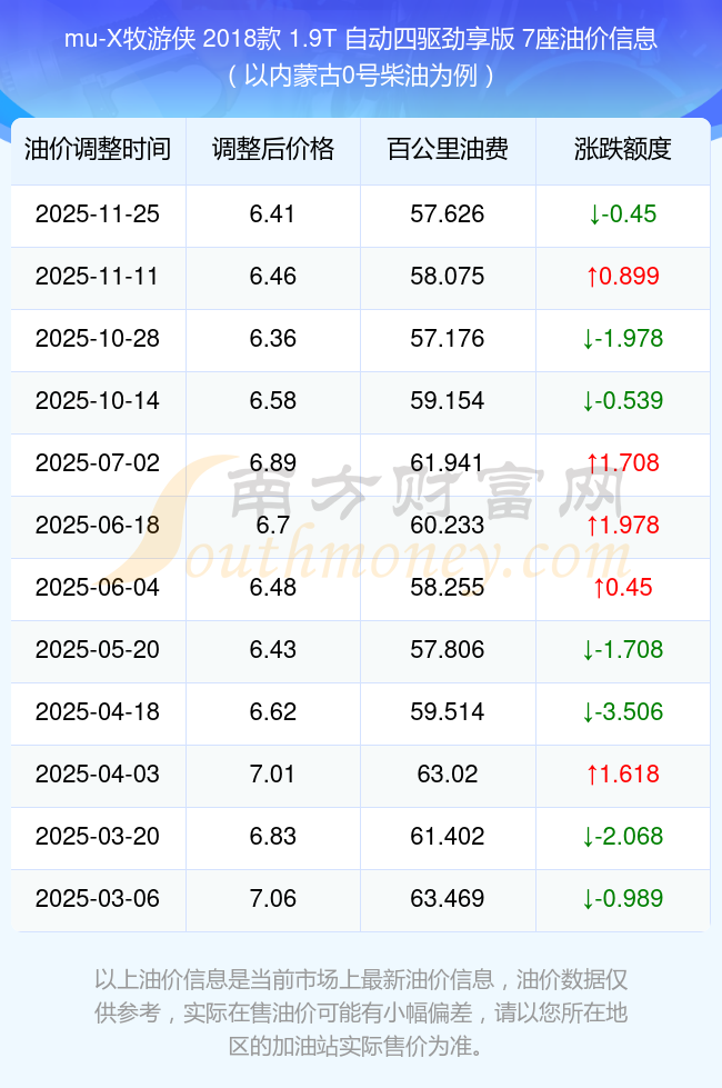 按11月25日0號柴油最新調(diào)整價(jià)格6.41元每升來計(jì)算(以內(nèi)蒙古為例),該車型百公里平均油費(fèi)為57.626元,按上一輪11月11日調(diào)整價(jià)格6.46元每升來計(jì)算,百公里平均油費(fèi)為58.075元,對比上一輪少花0.45元,下一輪油價(jià)調(diào)整時(shí)間為12月8日24時(shí)。