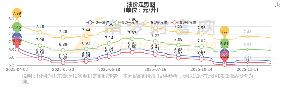 山東東營(yíng)92號(hào)汽油11月29日的價(jià)格為6.85元/升,本次油價(jià)的調(diào)整時(shí)間為11月25日,對(duì)比上次油價(jià)調(diào)整時(shí)間11月11日的價(jià)格6.91元/升,共減了0.06元,減幅達(dá)0.868%。下一輪油價(jià)調(diào)整時(shí)間12月8日24時(shí),距離現(xiàn)在還有9.27天。