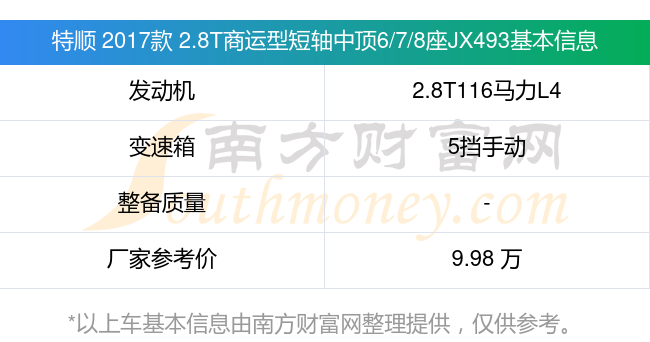 特順 2017款 2.8T商運型短軸中頂6/7/8座JX493動力方面,搭載的是一臺2.8T116馬力L4渦輪增壓發(fā)動機,匹配5擋手動擋變速箱,燃料形式為柴油,廠家參考價9.98萬元。