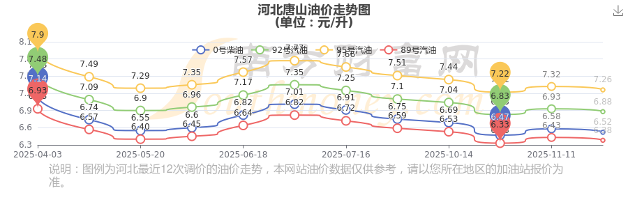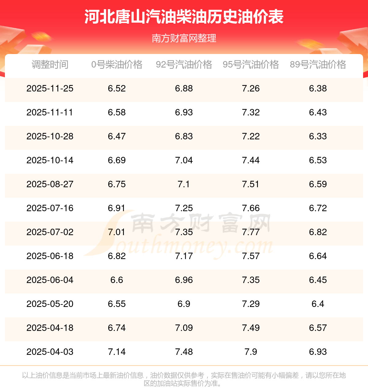 11月29日汽油柴油每升的價格為11月25日調(diào)整后的價格,具體如下:92號汽油6.88元;95號汽油7.26元;89號汽油6.38元;0號柴油6.52元。