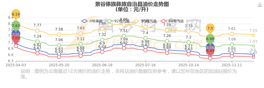 景谷傣族彝族自治縣11月29日0號柴油歷史油價調(diào)整走勢圖