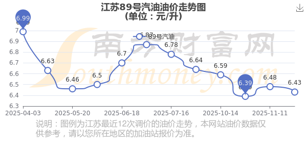 11月29日,江蘇89號(hào)汽油的價(jià)格是6.43元每升,本次的調(diào)整時(shí)間為11月25日,對(duì)比上次的調(diào)整減了0.05元,減0.772%,下次調(diào)整時(shí)間為12月8日24時(shí),還有9.23天。