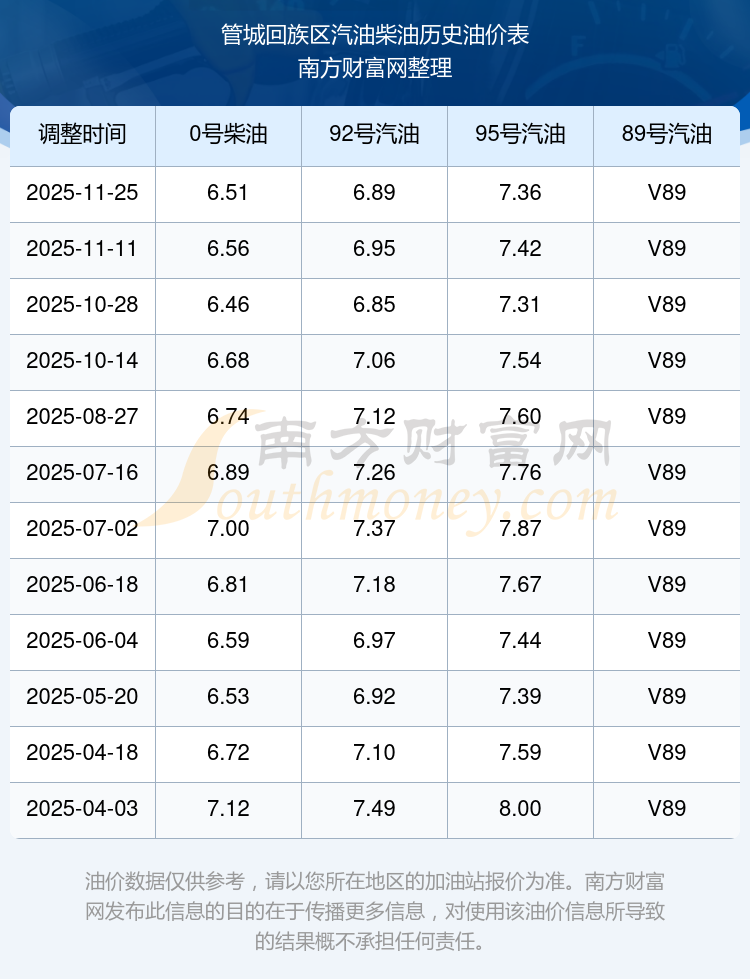 11月29日廣西汽油、柴油油價:本輪油價調(diào)整時間是11月25日,92號汽油6.95元,降了0.05元,降幅達0.71%;95號汽油7.51元,降了0.06元,降幅達0.79%;89號汽油6.47元,降了0.05元,降幅達0.77%;0號柴油6.58元,降了0.06元,降幅達0.9%。 2025年油價調(diào)價窗口日