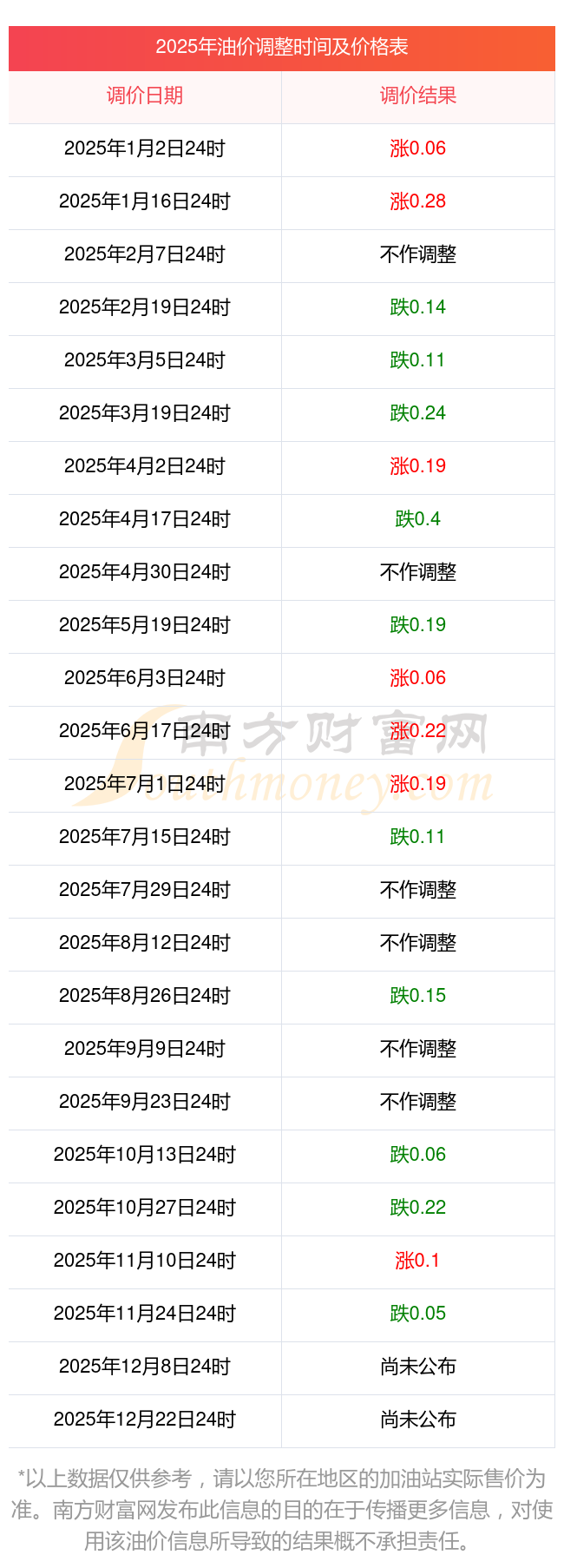 汽油價格調整最新消息:11月29日,全國0號柴油的最新價格是11月25日油價調整后的價格,具體為:平均價格7元/升,最低的是內蒙古,價格6.41元/升,最高的是貴州,價格6.63元/升。下一輪汽油價格調整時間12月8日24時,距離現(xiàn)在還有9.23天。