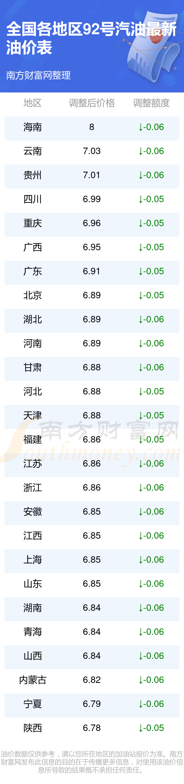 11月29日,河南92號汽油的價格是6.89元每升,本次的調(diào)整時間為11月25日,對比上次的調(diào)整減了0.06元,減0.863%,下次調(diào)整時間為12月8日24時,還有9.23天。