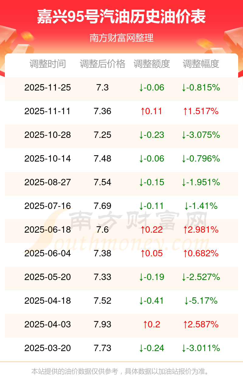 11月29日嘉興95號汽油的價格是7.3元/升(調(diào)整時間為11月25日),對比上次調(diào)整時間11月11日的油價7.36元/升,下跌了0.06元,下跌幅達(dá)0.815%。下一輪油價調(diào)整時間12月8日24時,距離現(xiàn)在還有9.22天。