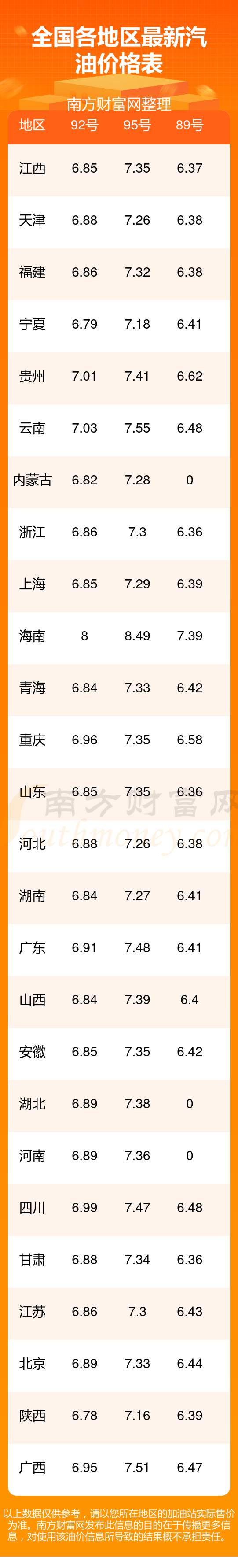 全國(guó)89號(hào)汽油最新平均價(jià)格為:6元每升,其中,最高為海南,價(jià)格為7.39元/升,最低為浙江,價(jià)格為6.36元/升。