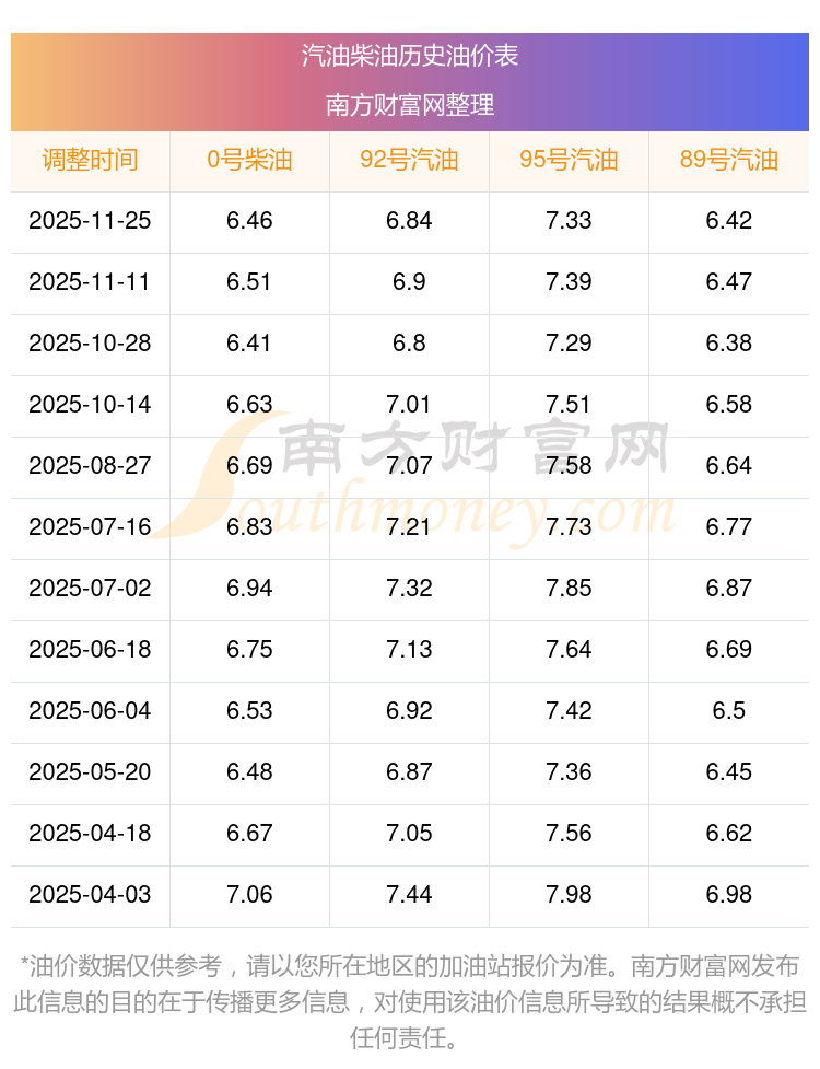 11月29日青海玉樹92號汽油的最新價格:青海玉樹92號汽油6.84元/升(根據(jù)11月25日調(diào)整后的價格),相對上次調(diào)整時間11月11日的油價6.9元每升,下降了0.06元,下降0.87%。下一輪油價調(diào)整時間12月8日24時,距離現(xiàn)在還有9.21天。