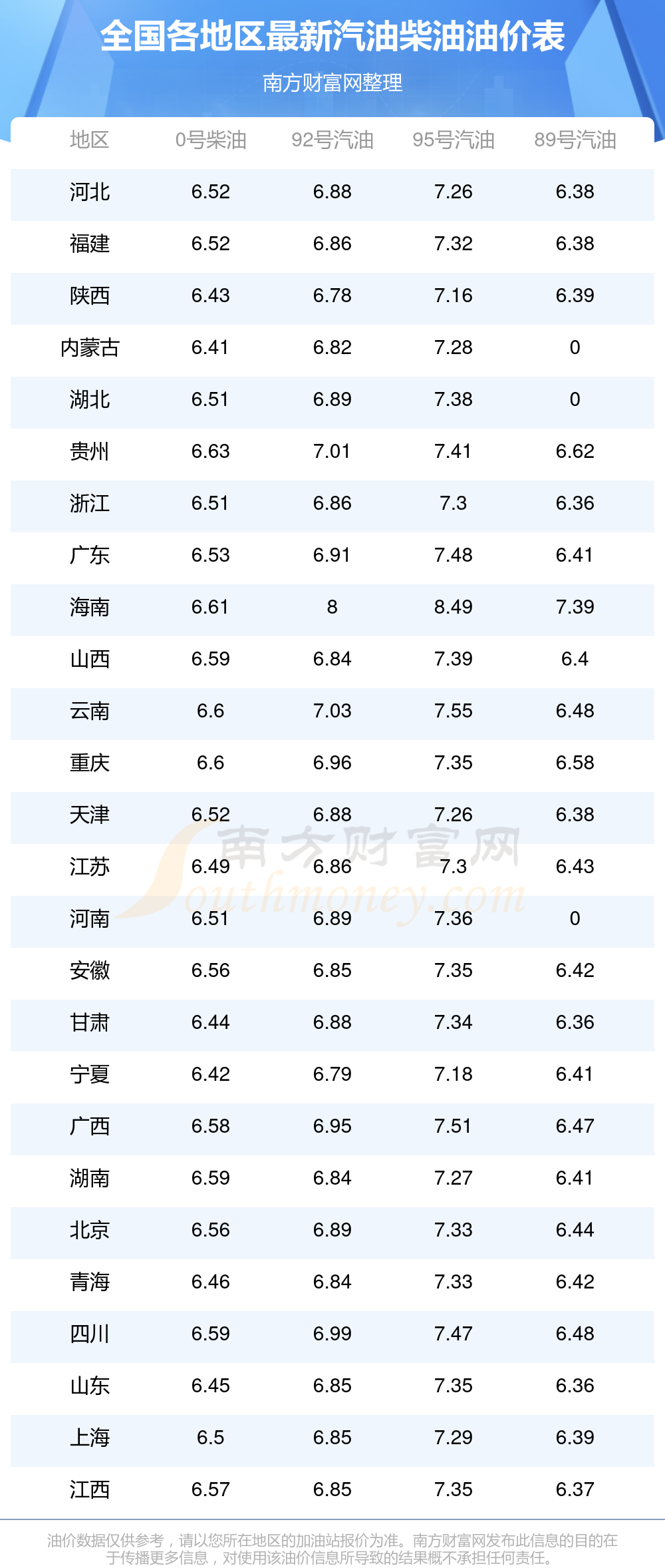 油價(jià)數(shù)據(jù)僅供參考,請(qǐng)以您所在地區(qū)的加油站報(bào)價(jià)為準(zhǔn)。南方財(cái)富網(wǎng)發(fā)布此信息的目的在于傳播更多信息,對(duì)使用該油價(jià)信息所導(dǎo)致的結(jié)果概不承擔(dān)任何責(zé)任。