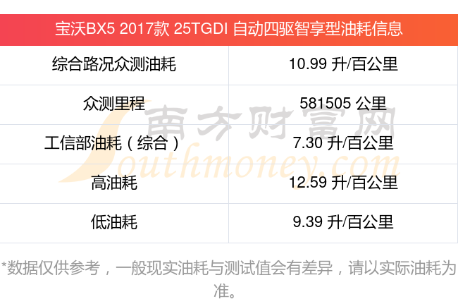 根據(jù)車主實測數(shù)據(jù),該車型低油耗為9.39升/百公里,高油耗為12.59升/百公里,綜合路況眾測油耗為10.99升/百公里,工信部綜合油耗為7.30升/百公里。