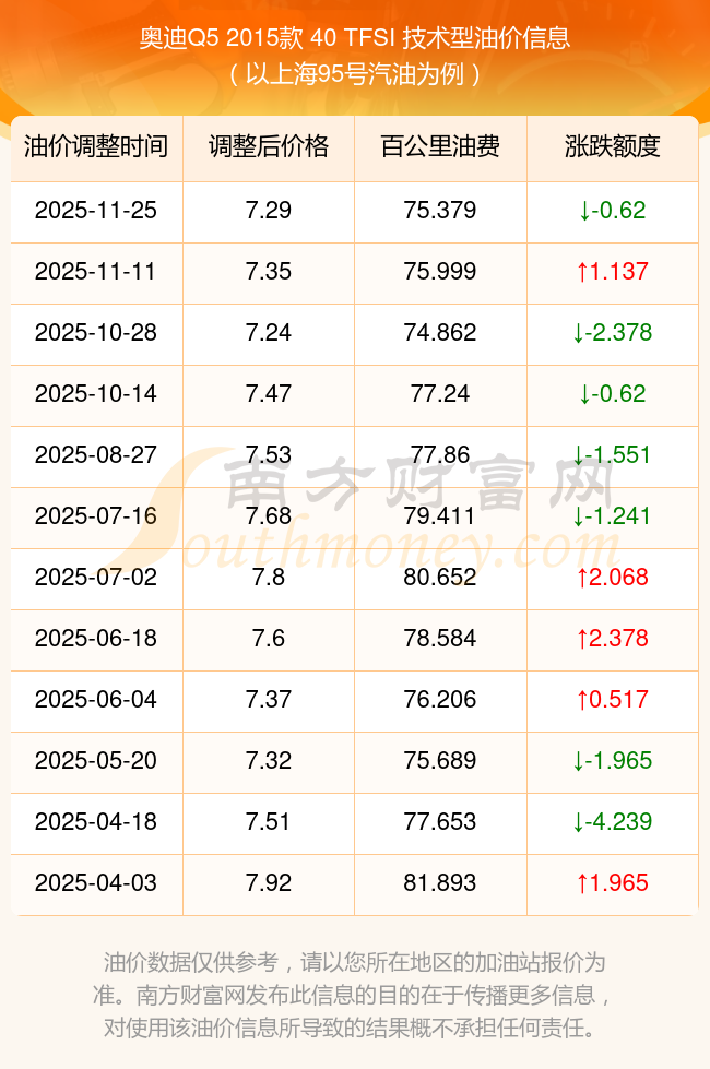 根據(jù)11月25日95號汽油最新調(diào)整價格7.29元/升來計算(以上海為例),該車型每百公里的平均油費是75.379元,上一輪11月11日調(diào)整價格7.35元每升來計算,每百公里的平均油費是75.999元,對比上一輪少花0.62元,下一輪的油價調(diào)整時間是12月8日24時。