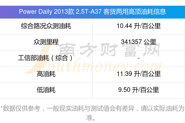 根據(jù)車主實測數(shù)據(jù),該車型低油耗為9.50L/100km,高油耗為11.39L/100km,綜合路況眾測油耗為10.44L/100km,工信部綜合油耗為-L/100km。