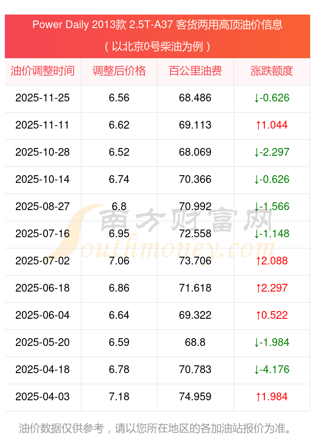 按照11月25日0號柴油最新調整價格6.56元/升來計算(以北京為例),該車型百公里平均油費為68.486元,按照上一輪11月11日調整價格6.62元/升來計算,百公里平均油費為69.113元,對比上一輪少花0.626元,下一輪油價調整時間為12月8日24時。