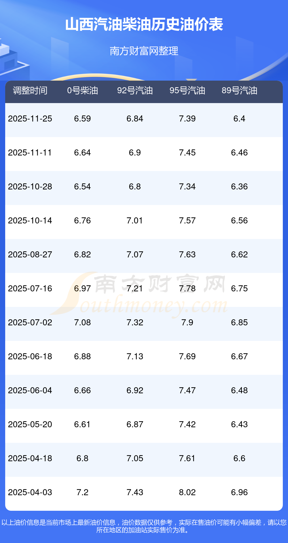 山西2025年最新汽油柴油歷史油價表