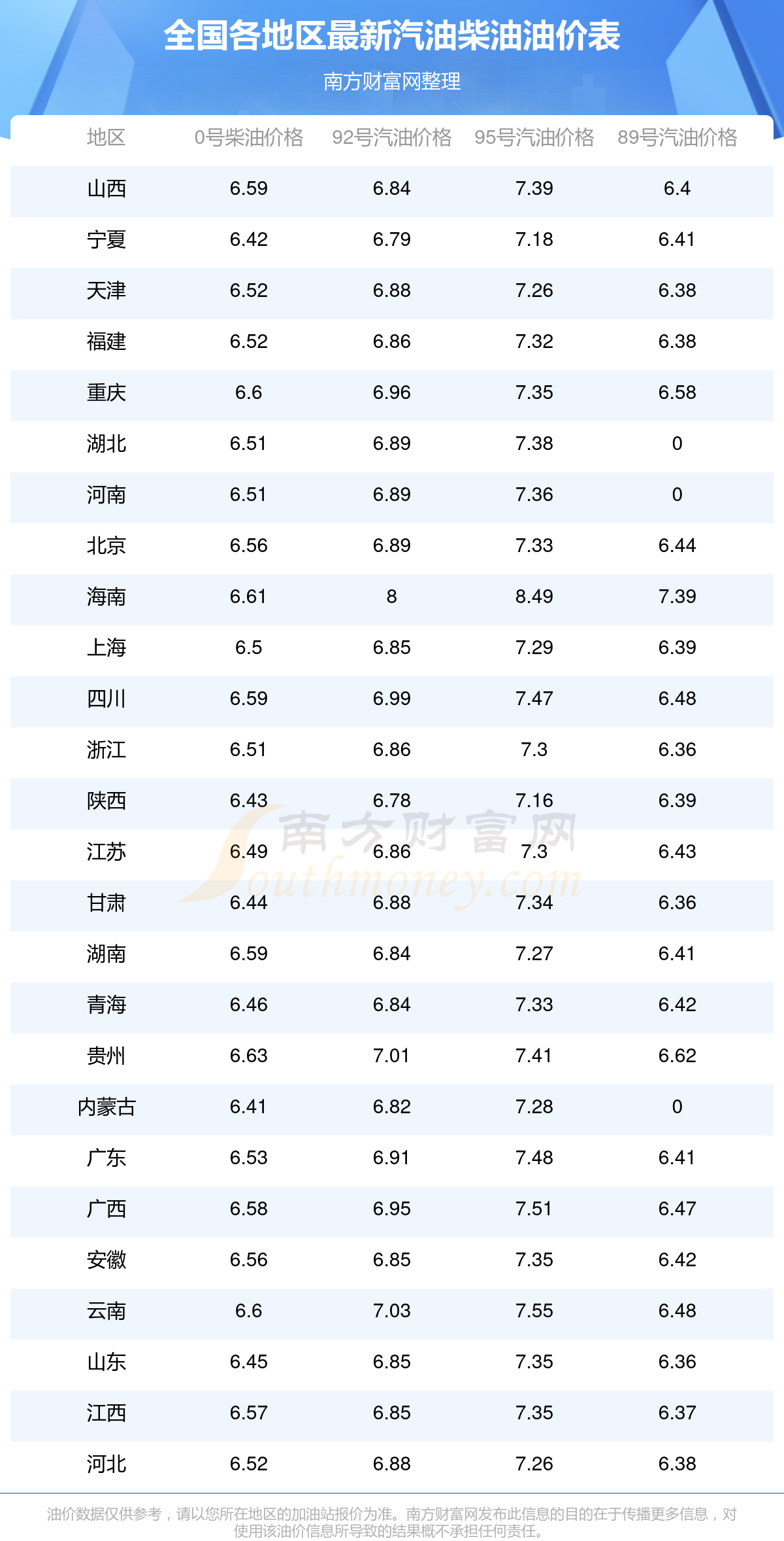 2025年全國(guó)各地區(qū)汽油價(jià)格表