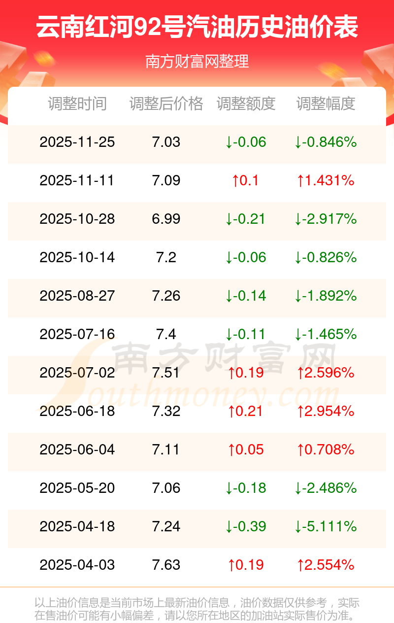 2025年92號(hào)汽油價(jià)格調(diào)整一覽表