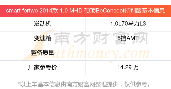 在動(dòng)力方面,smart fortwo 2014款 1.0 MHD 硬頂BoConcept特別版搭載的是一臺(tái)1.0L70馬力L3自然吸氣發(fā)動(dòng)機(jī),匹配5擋AMT自動(dòng)檔變速箱,燃料形式為汽油,廠家參考價(jià)14.29萬元。