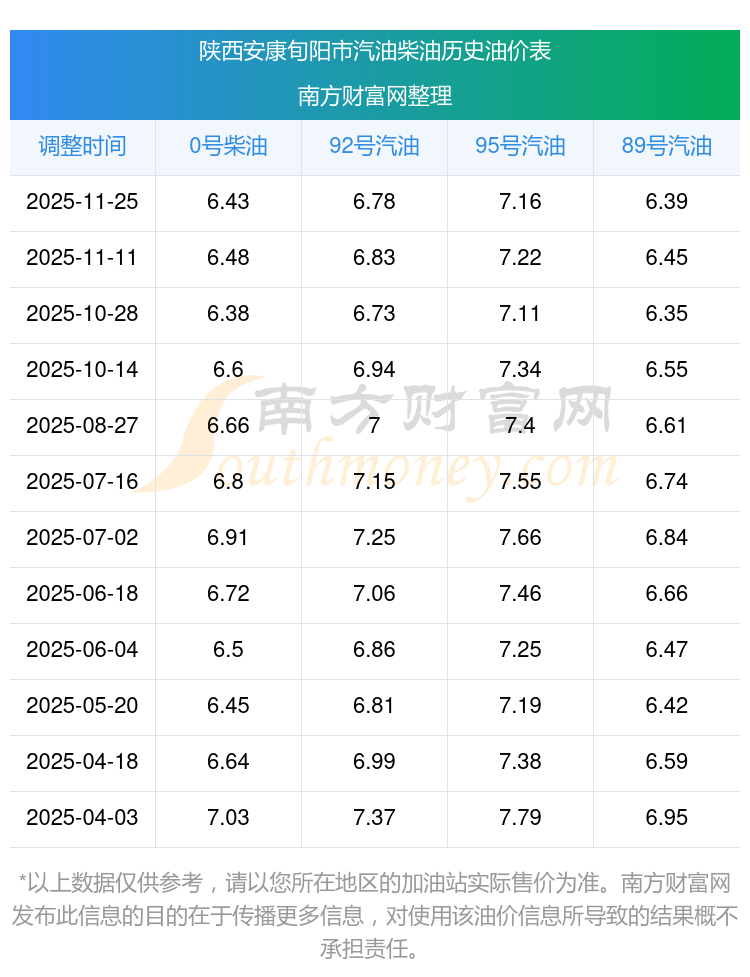 2025年陜西安康旬陽市汽油價格一覽表